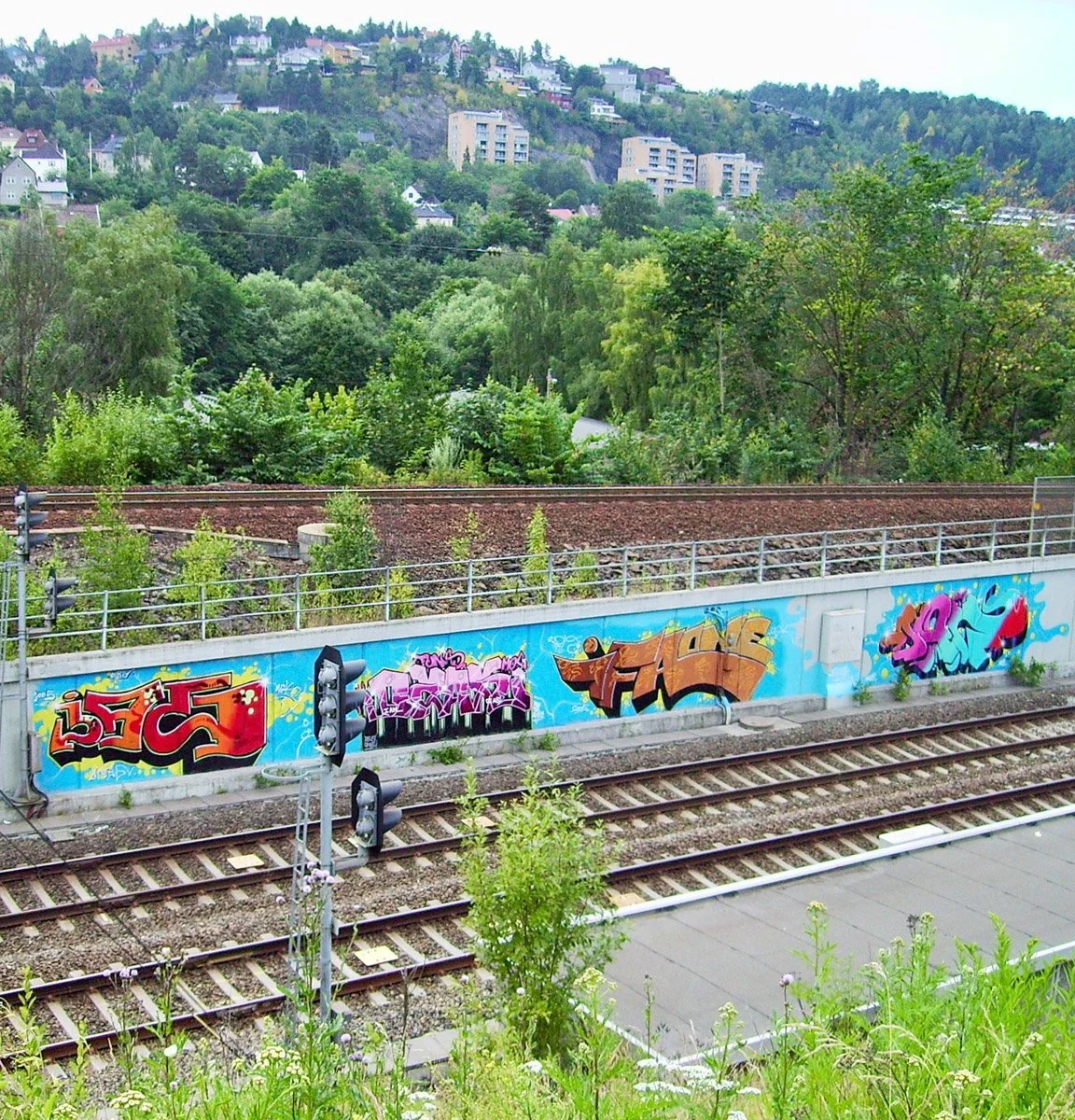 Linje-piecer av graffitikunstnerne Jag (UGK NINJAS), Tuns (MOC), Ifa (UGK) og Dao (CSM AW POS KD COD) Kvernerdalen i Oslo, 2004. Foto: StayOne