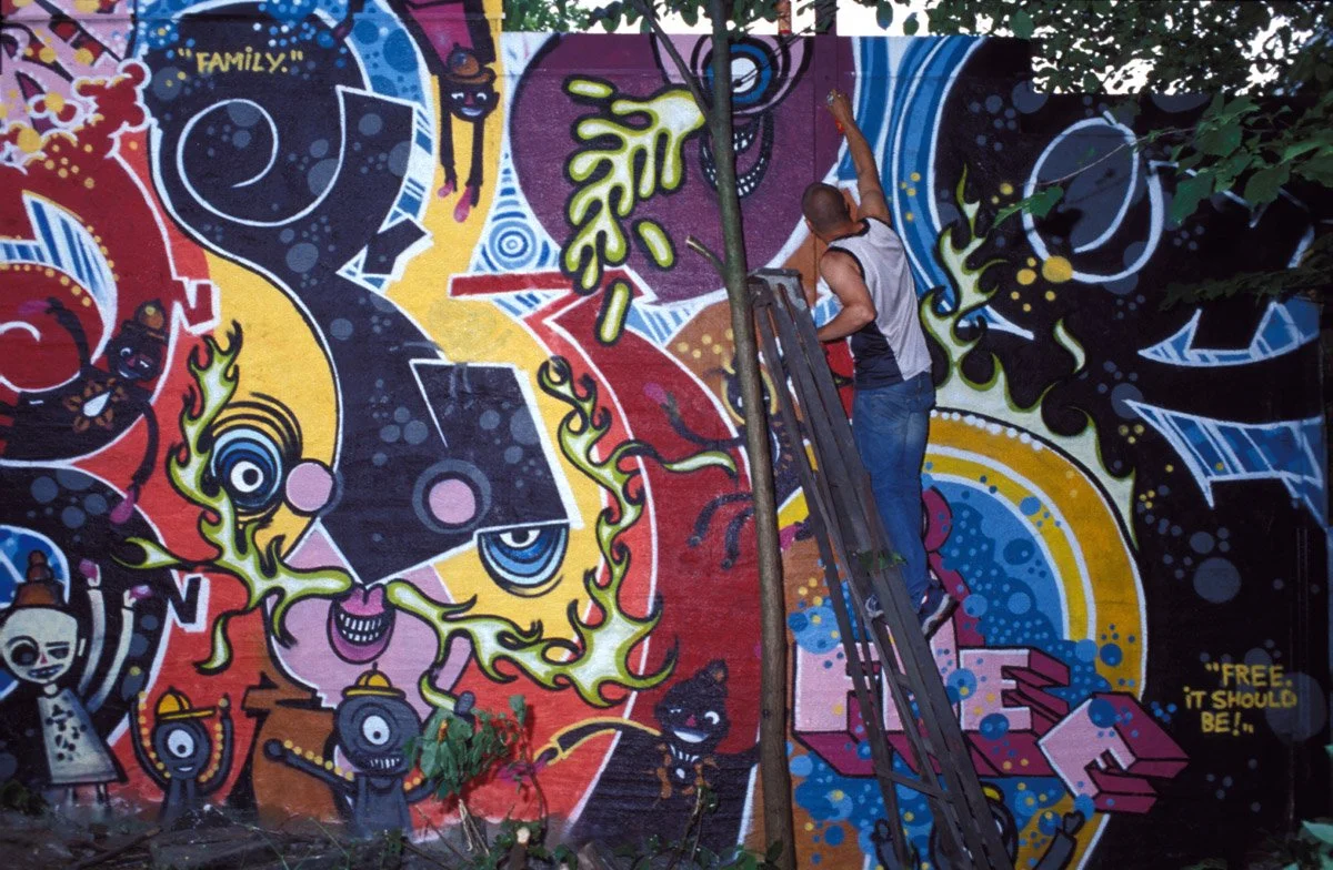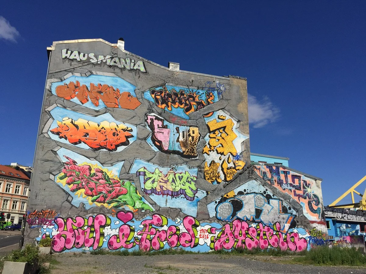 Dette vegmaleriet på Hausmania i Oslo ble malt på 2000-tallet og fikk stå i over 10 år før det ble bygget inn av et nytt bygg på tomten foran veggen. Veggmaleriet ble malt av graffitikunstnerne Jame, Ridder, Ceng, Kneck, Optik, Mast, Skog, Xno og Eksem. Foto: Beelectro / Per Egil Haram