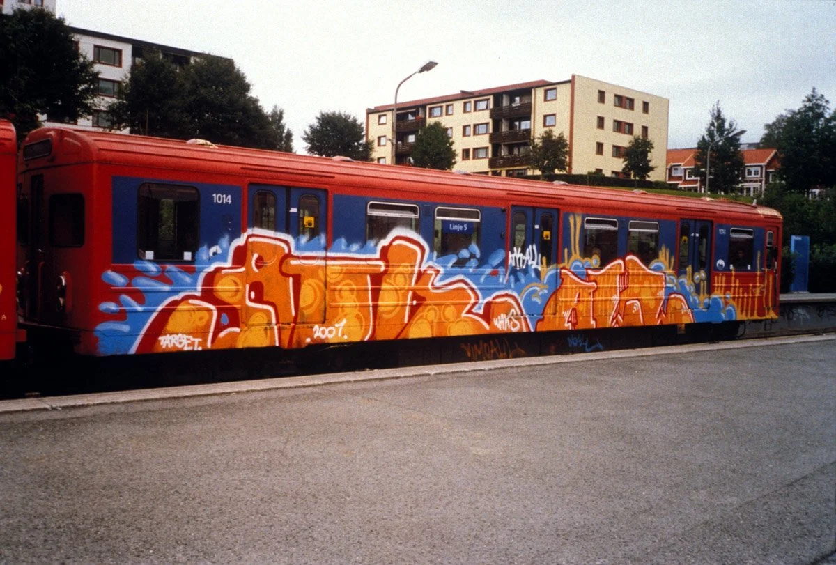 Graffiti på t-banen av ATK ALL, Linje 5 i Oslo, 2001. Foto Gard Andreas Frantzsen, Gategallerier