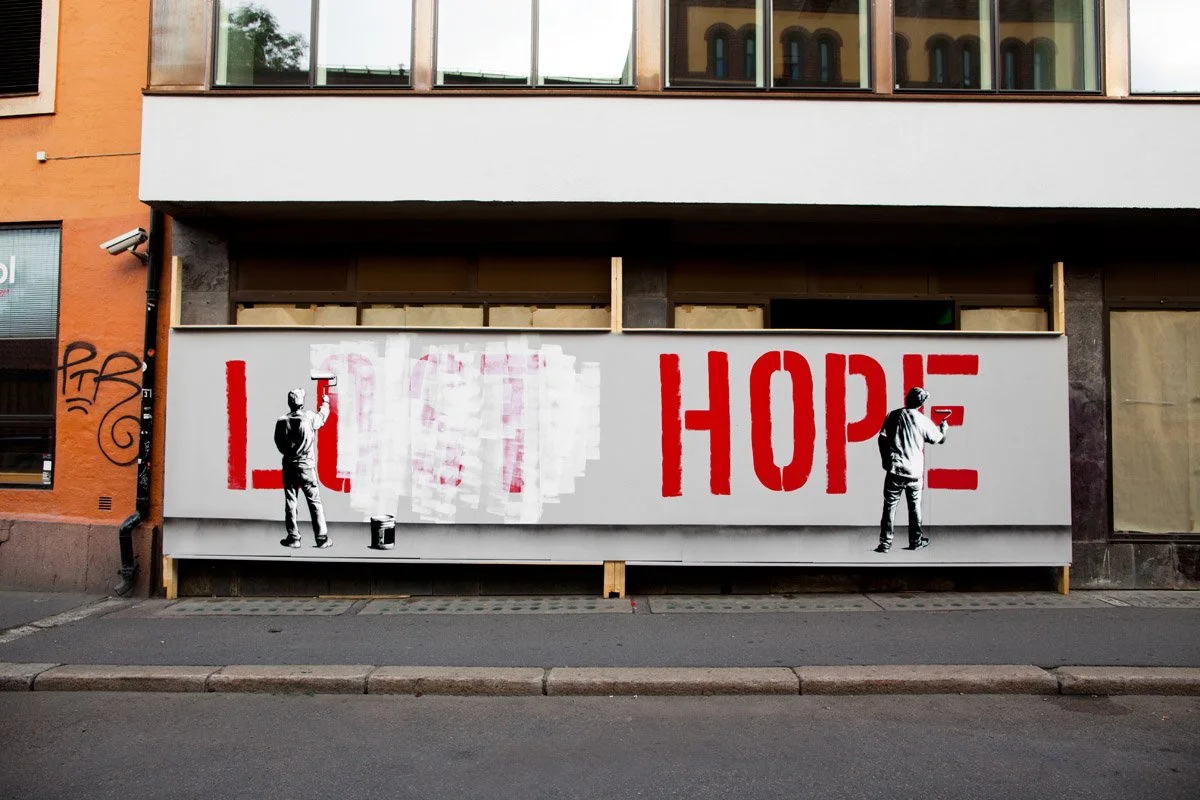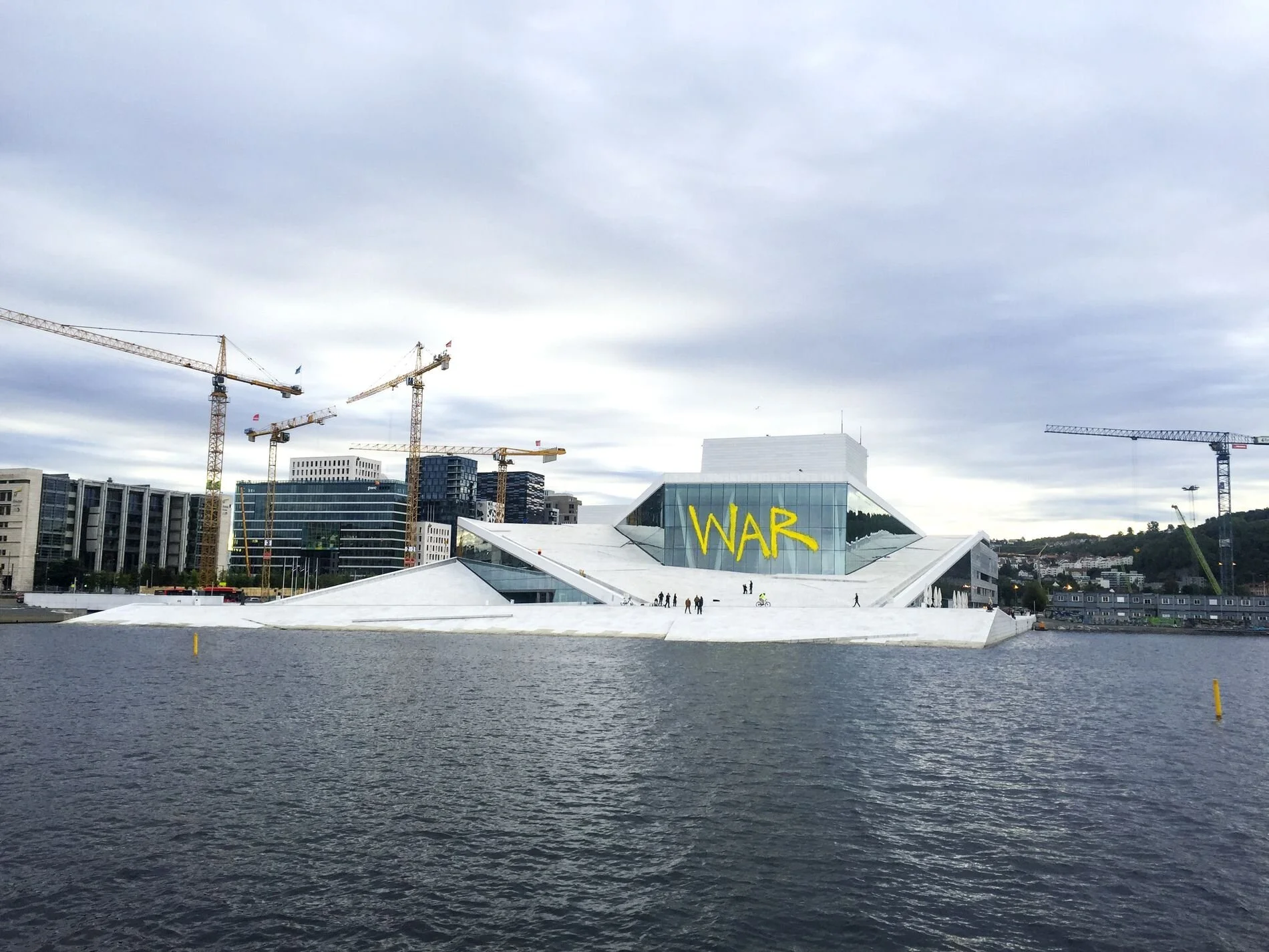 I 2016 malte kunst kollektivet The Stupid Mammals, bestående av gatekunstnere fra Oslo, “WAR” på Operaen som et reklamestunt for operaoppsetningen “War Requiem”. Foto: Privat