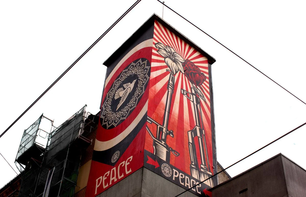 Den Amerikanske street art kunstneren Shepard Fairy lagde dette verket på Majorstuen i Oslo under TJ Artwalk i 2011. Foto: Privat