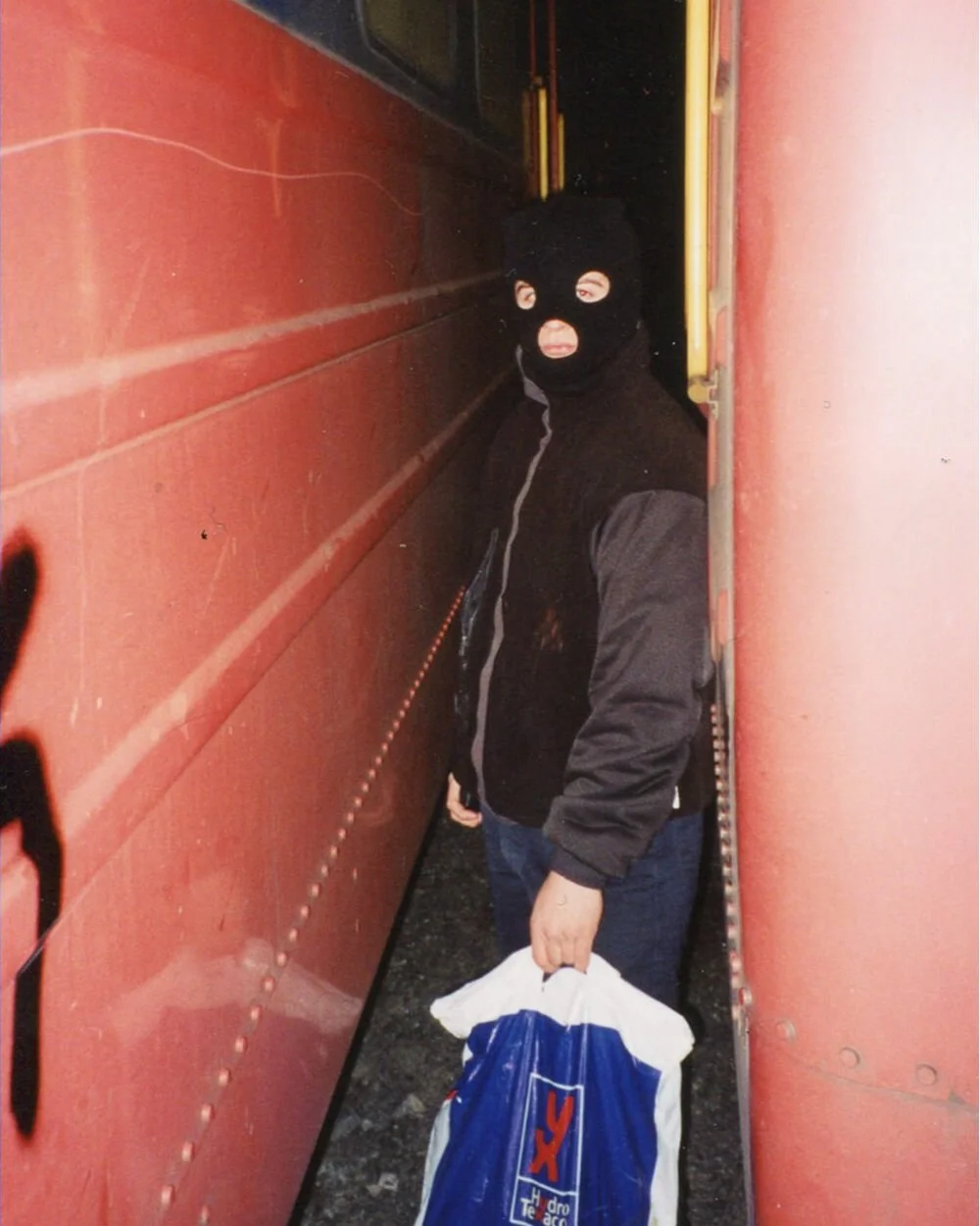 En writer maler graffiti på en t-bane vogn i Oslo, 90-tallet. Foto: Juan