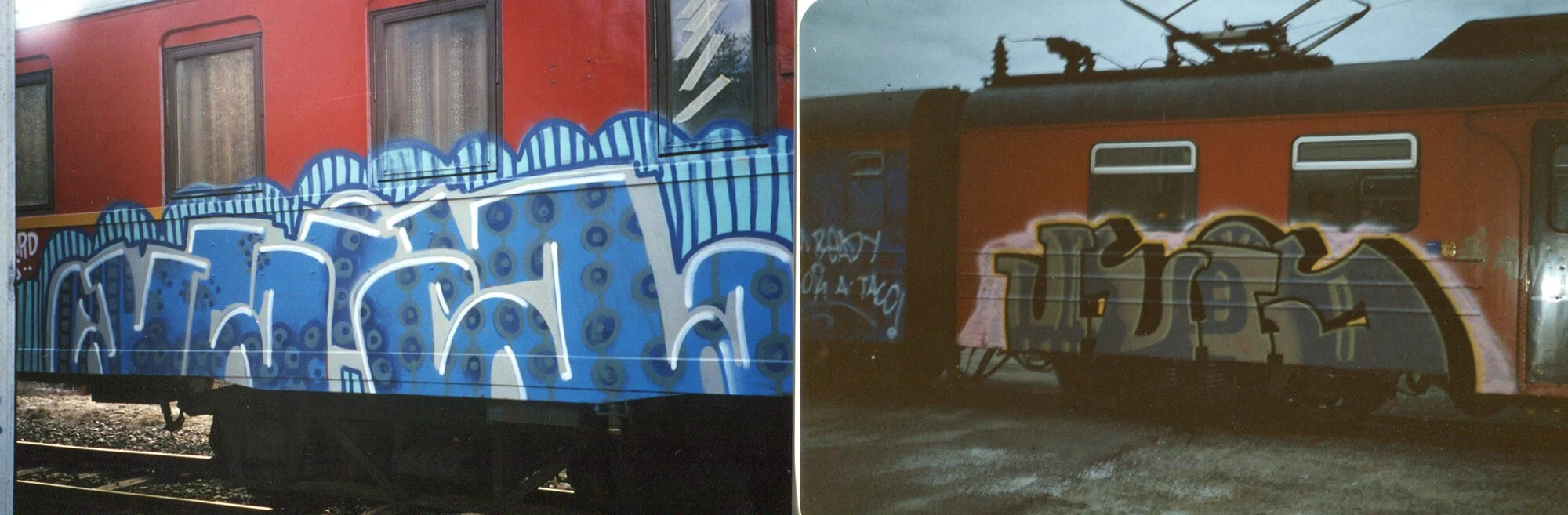 Graffitipiecer av VEIS på togvogner på 90-tallet. Foto: WEIS