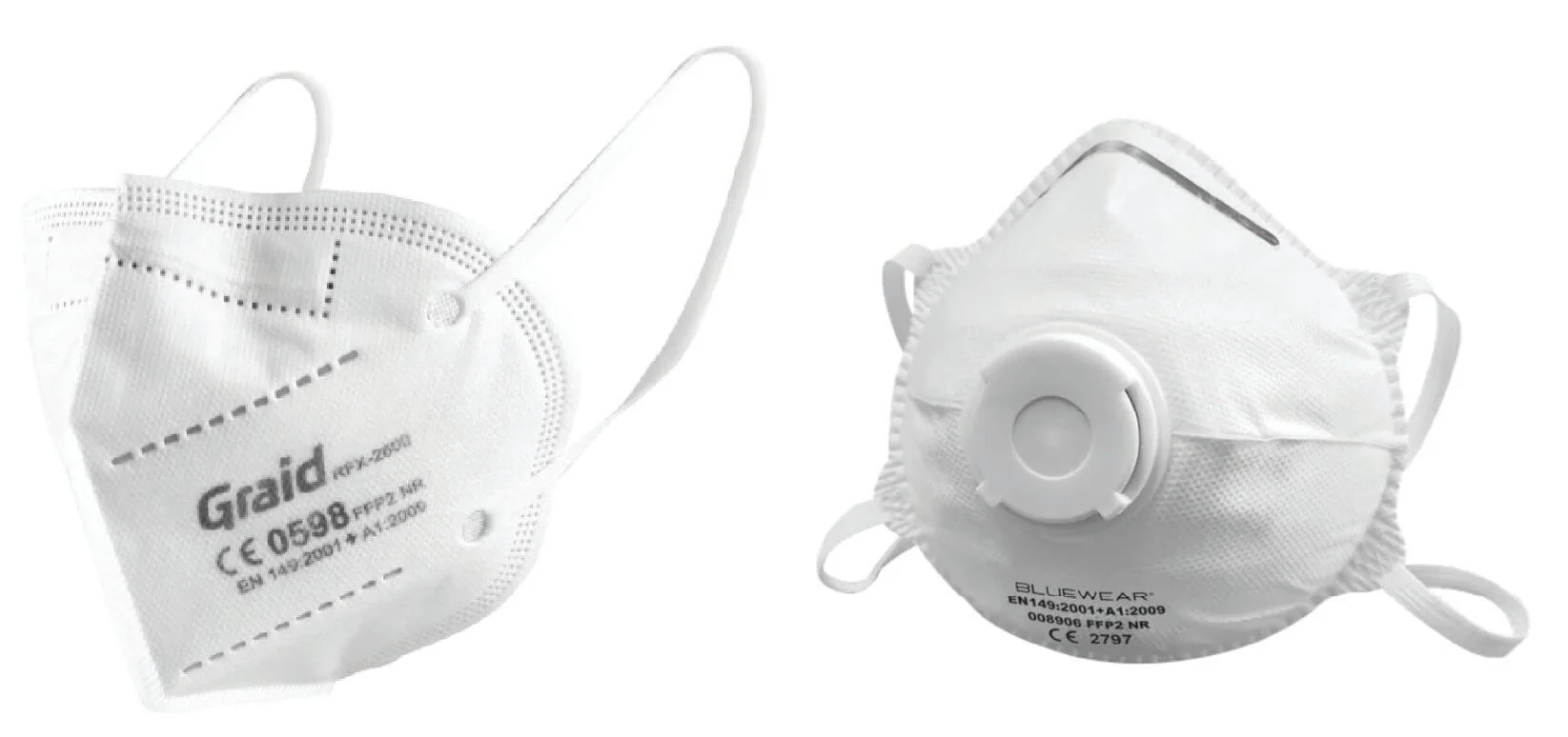 Slike masker er markert FFP2 og kan kjøpes blant annet på Clas Ohlson, Jula eller Obs bygg for 20kr stykk.