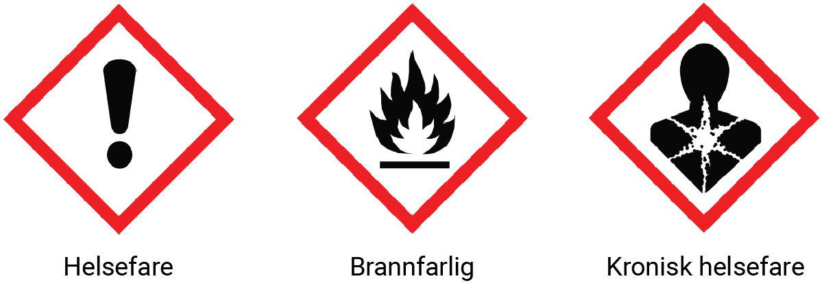 De man mest sannsynlig finner på sprayboksen er utropstegn (helsefare), bålflamme (brannfarlig) og menneskefigur med et stjernesymbol på brystet (kronisk helsefare).