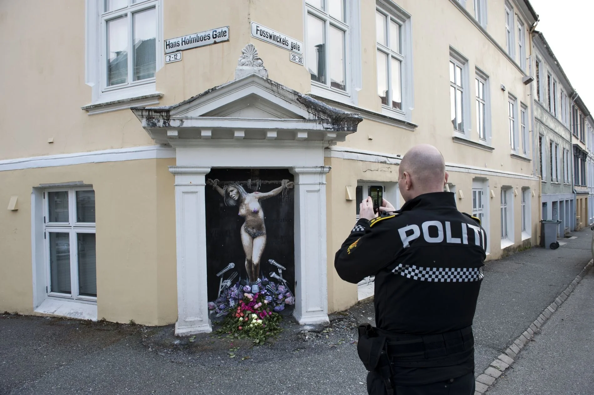 Kunstverket er satt opp ved krysset mellom Hans Holmboes gate og Fosswinckels gate i Bergen sentrum, og har i løpet av dagen utløst debatter i samtlige kommentarfelt rundt om i det ganske land. Piecen viser Listhaug hengt opp på ett kors med tornekrans på hodet, hun er omgitt mikrofoner og i bakgrunnen er det malt inn flere slagord som blant annet Mass Surveillance, Yemen, Free Palestina og Legalization.